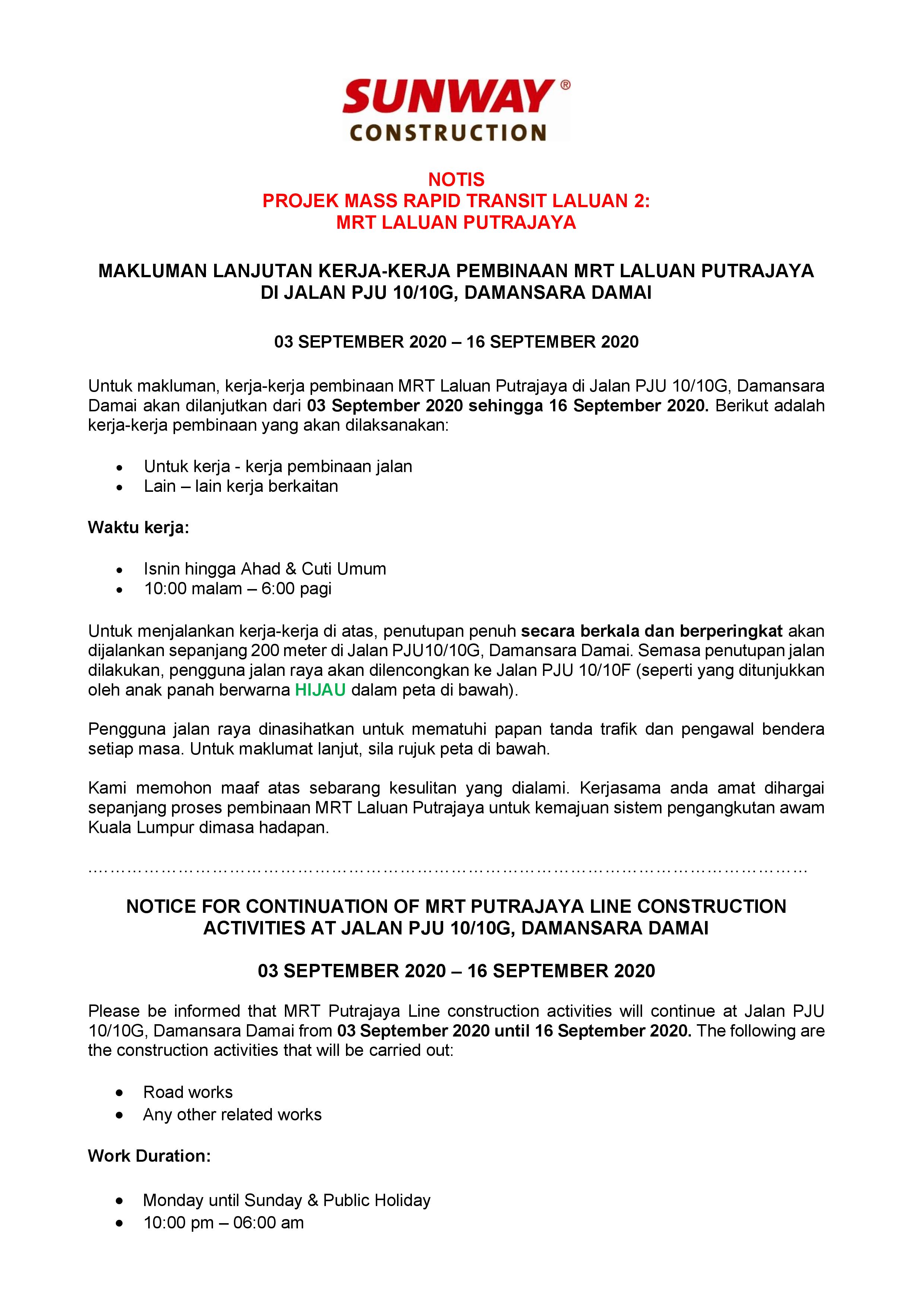 Mrt Corp On Twitter Notice For Continuation Of Mrt Putrajaya Line Construction Activities At Jalan Pju 10 10g Damansara Damai 03 September 2020 16 September 2020 Kltu Https T Co Ja5yrtdsxk Twitter